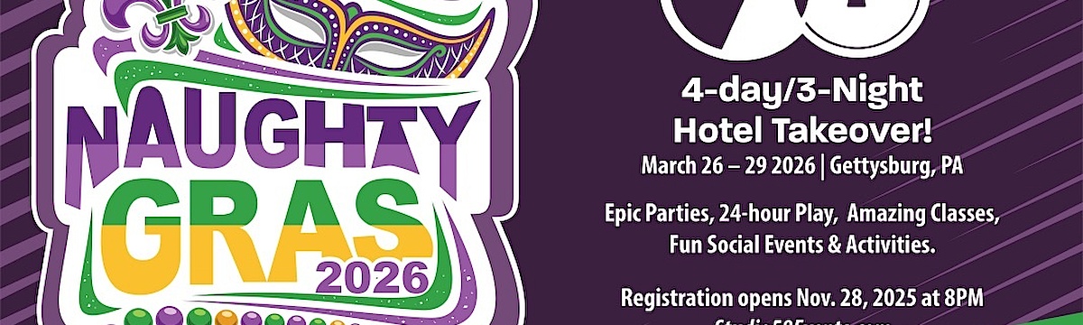 Surround yourself with the glamorous high spirits of Mardi Gras at this enchanting four-day party designed for our Studio 58 friends and their partners. We recreate New Orleans’ French Quarter across our two host hotels where the sights and sounds of kinky Mardi Gras will echo all weekend. Socialize with other kinksters and make new connections inside a fantasy bubble filled with all things celebrating Mardi Gras and BDSM. Education remains a high priority for this event.